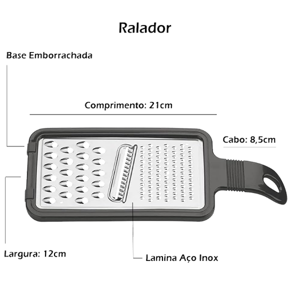 | Características | Lâminas de aço inox, Cabos de polipropileno, Ralador de ABS com base, emborrachada antideslizante, Resistente à maquina de lavar |