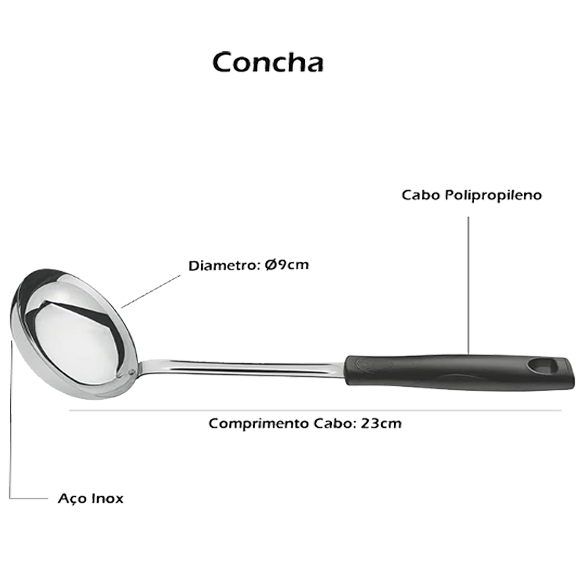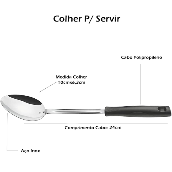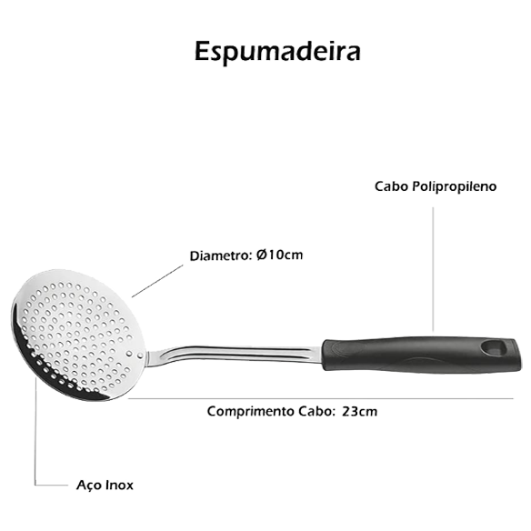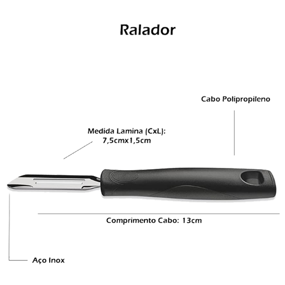 | Contém | 1 Colher, 1 Espumadeira, 1 Concha,1 Descascador para Batatas , 1 Ralador |