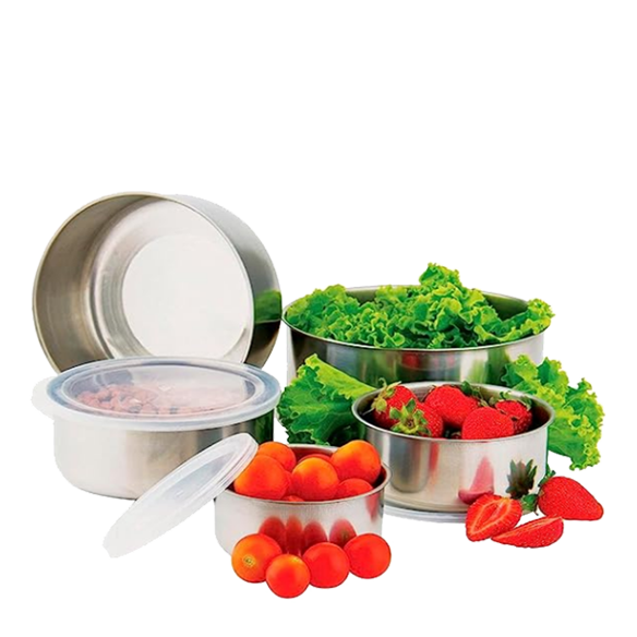 R$ 79,90Conjunto de Potes em inox, são 5 peças em aço inox que proporcionam ao seu dia a dia mais praticidade e versatilidade em sua cozinha. Além da função de preparar e misturar os alimentos esse super conjunto traz mais beleza e requinte na hora de servir. Leve massas, saladas, guarnições e molhos à sua mesa com mais estilo e qualidade. Dê um toque todo especial na decoração de suas refeições! 5 potes de aço inox e 5 tampas de plástico.