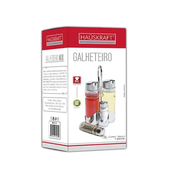 R$ 29,90O Conjunto Galheteiro é formado por 1 Azeiteiro (160ml), 1 Vinagreiro (160ml), 1 Saleiro (40ml) e 1 Pimenteiro (40ml). Com um suporte de Inox, perfeito para deixar sua mesa muito de apresentar design sofisticado. Evite pancadas, quedas e choques térmicos, produto frágil. No caso de quebra, poderá causar cacos de vidro cortantes e perfurantes. Evite acidentes, mantenha fora do alcance das crianças.- Cuidados: Lave com detergente neutro e enxágue com água em abundância. Para secar, utilize um pano seco e macio. Evite o uso de produtos abrasivos.- Características: Fácil e prático.